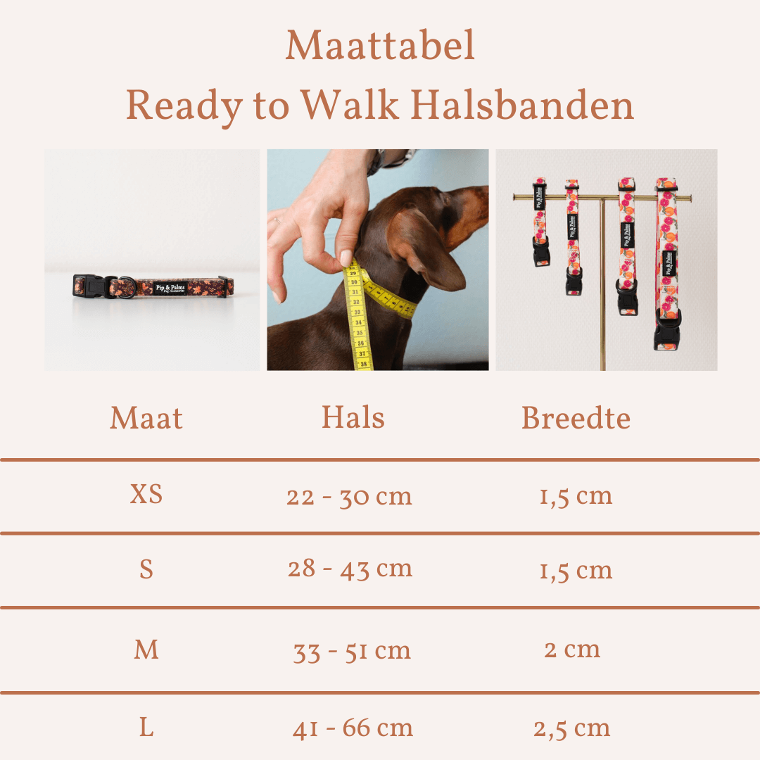Bovenstaand vind je de maten van de Ready to Walk halsbanden. Zorg er altijd voor dat er minimaal twee vingers ruimte zit tussen de nek en de halsband. Meer informatie over het opmeten van de halsomvang vind je hier.